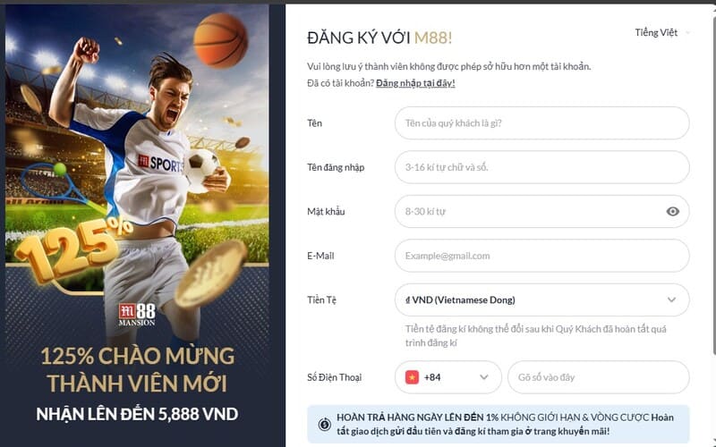Sau khi truy cập link vào M88 mới nhất việc đăng ký tài khoản chỉ mất chưa đầy 3 phút