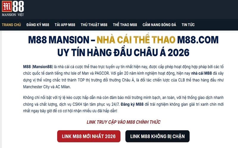 M88 hay còn gọi là Mansion88 từ lâu đã khẳng định vị thế là “người anh cả” trong ngành cá cược tại khu vực châu Á. Tuy nhiên, việc các nhà mạng thường xuyên quét và chặn truy cập khiến người chơi gặp không ít khó khăn. Bài viết này sẽ cung cấp cho bạn những đường link vào M88 uy tín không sập mới nhất 2026, giúp bạn duy trì trải nghiệm mượt mà và bảo mật tuyệt đối.